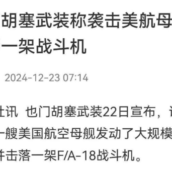 【明着打脸?胡赛武装声称击落美军战斗机,还放出了F/A18坠毁的现场视频】12月22日,美军杜鲁门号航母战斗群在空袭也门的时候,突然有一架F/A18双座舰载机坠毁,随后美军宣称这是被自家提康德罗加级巡洋舰误击的。正在外界猜疑美军怎么会犯这么低级错误的时候,也门胡赛的打脸来了,他们称对美国航母发动了大规模袭击,F/A18就是自己击落的。